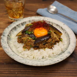 甜麺醤、酒、しょうゆ、鶏がらスープの素、水を加え、軽く煮立たせる。<2>を戻し入れ、なすが崩れない程度に炒め煮する。
