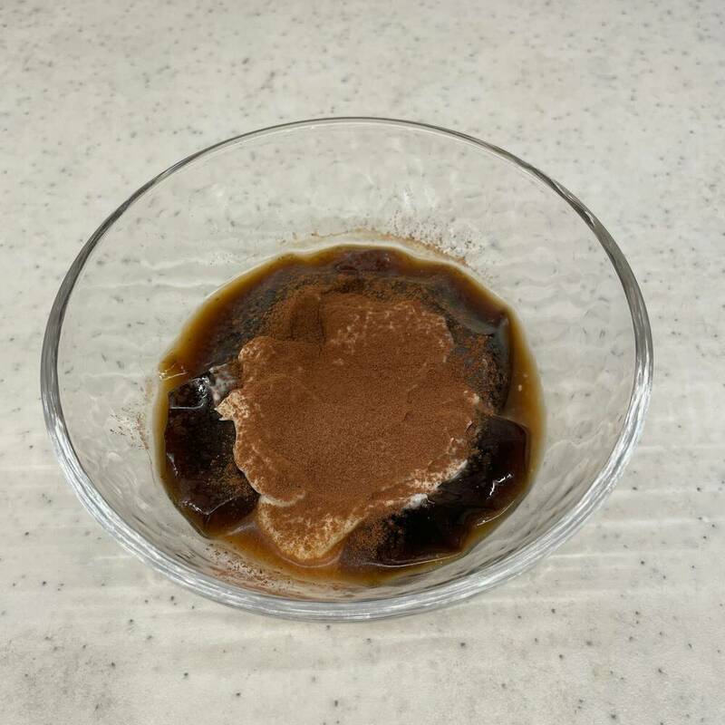 器にコーヒーゼリーを盛り、<1>をのせる。ココアパウダーをふるう。