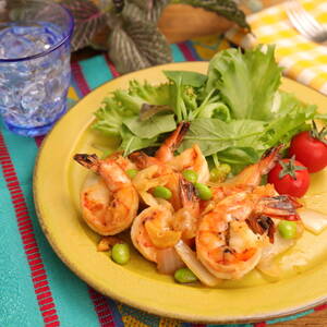 オリーブ油を少量加えて中火で熱し、エビを並べて塩こしょう(分量外)する。両面焼き色が付いたら玉ねぎを加えて炒め合わせる。
