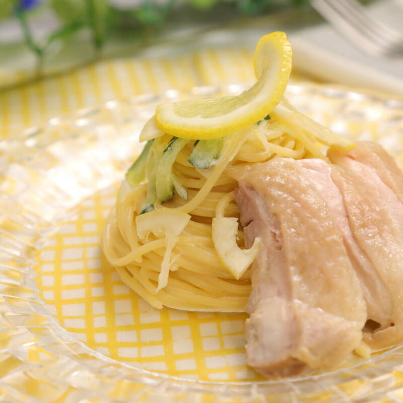 食べやすい大きさに切った鶏肉を添える。レモンに切り込みを入れて左右にひねり、飾る。