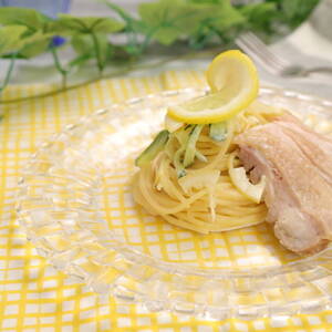 ボウルでスパゲッティ、<4>、きゅうり、耐熱皿に残った水分を大さじ1程度加えて混ぜ合わせる。塩で味を調え器に盛り付ける。