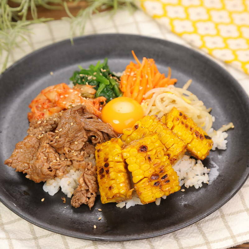 器にご飯を平らに盛り、<3><7><9>、白菜キムチをバランスよく盛り付ける。