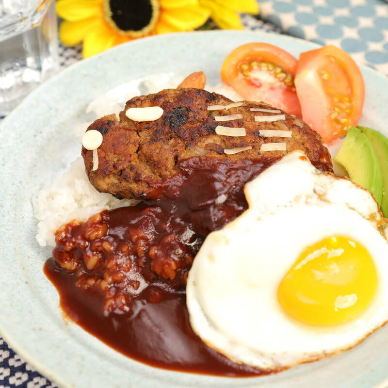 器にごはんを平らに盛り、中央に<7>のL字の辺の長い方を顔になるように盛り付ける。 トマト、アボカドも盛り付ける。