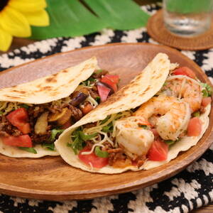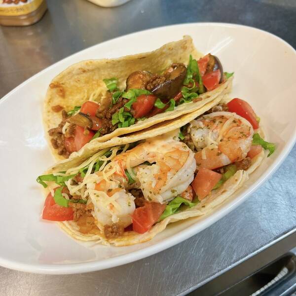 【ガーリックシュリンプタコス】トルティーヤにレタス、トマト、タコミート、ガーリックシュリンプ、シュレッドチーズをのせる。