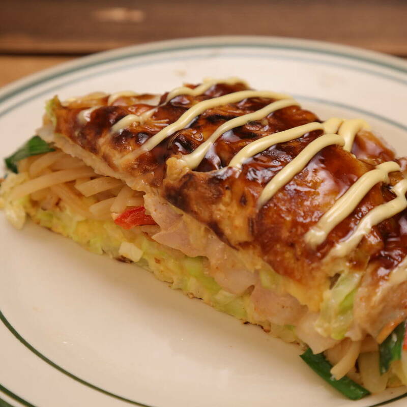器に盛り、ソースを塗ってマヨネーズをかける。同様にもう一枚焼く。