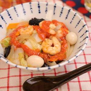 弱火にし、<4>を再度混ぜ合わせてから加え、とろみがつくまで加熱する。うずらの卵を加えてなじむまで混ぜ合わせる。