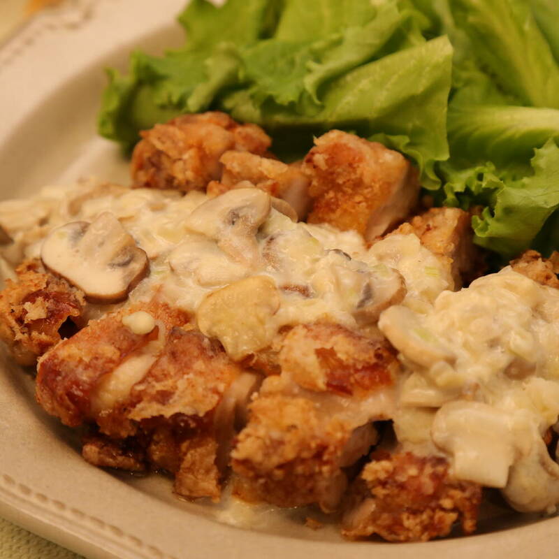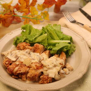 鍋にサラダ油を注いで中火で熱する。鶏肉の水分をペーパータオルで拭き取り、全体に片栗粉を塗す。