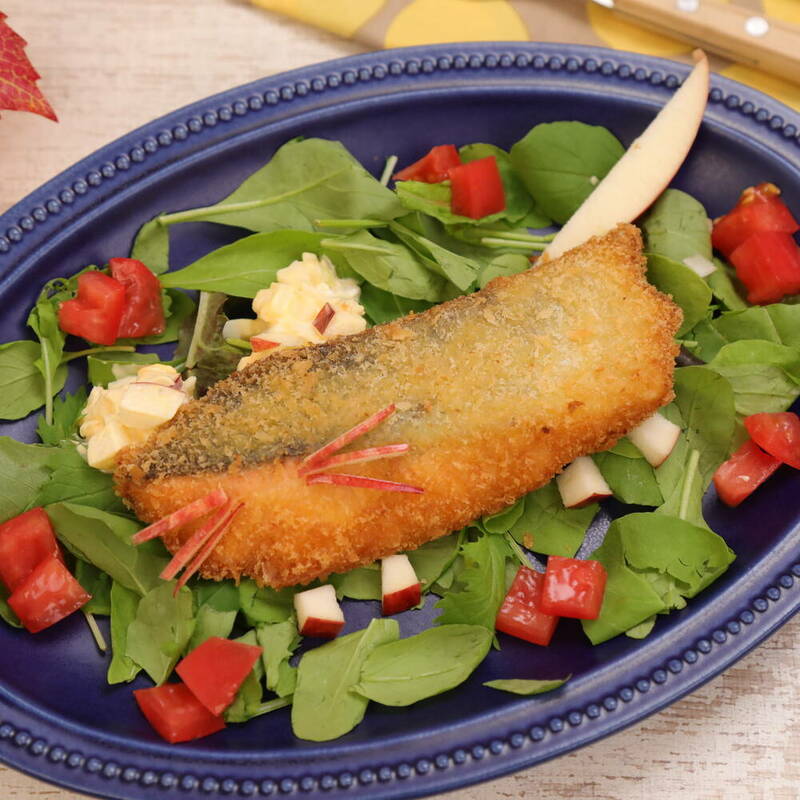 器にベビーリーフ、トマト、サーモンフライを盛り付け、りんごで髭、足、尻尾をのせる。タルタルの一部を使って猫耳を作る。