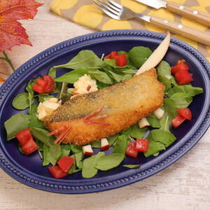 【サーモンフライ】鮭はペーパーで水分をしっかりと除き、塩、粗びき黒こしょうをふる。