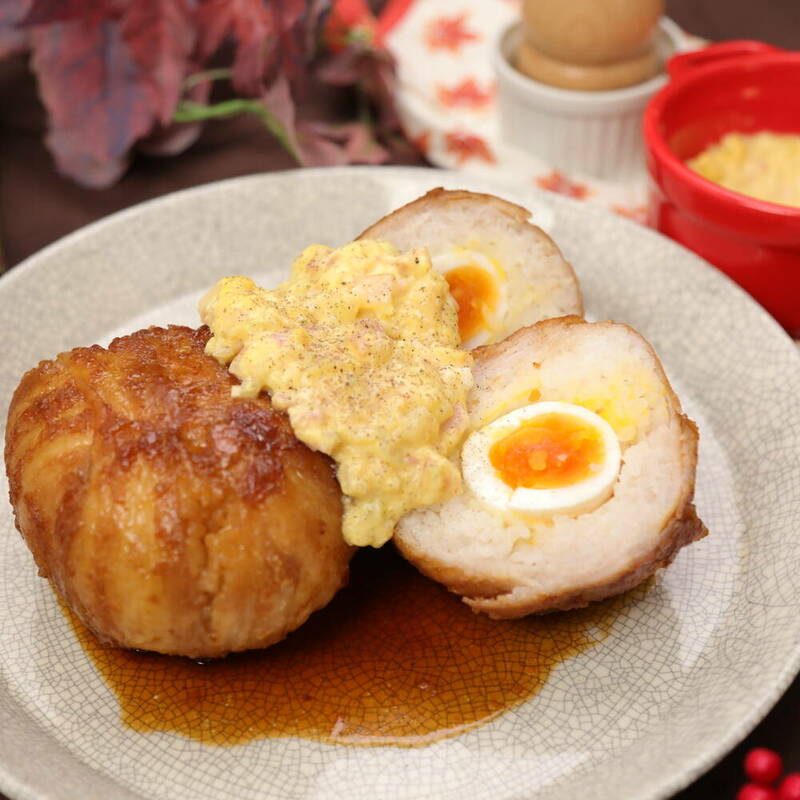 ごはんをラップに半分ずつ分け、平らに広げる。真ん中に味玉をおき、ラップの端を持ち上げ、味玉を包むようにごはんを握る。