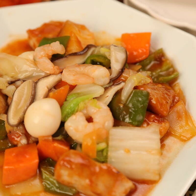 玉ねぎがしんなりしたら、混ぜ合わせた【C】を加えて混ぜながらとろみをつけて器に盛り付ける。<5>をかける。
