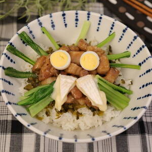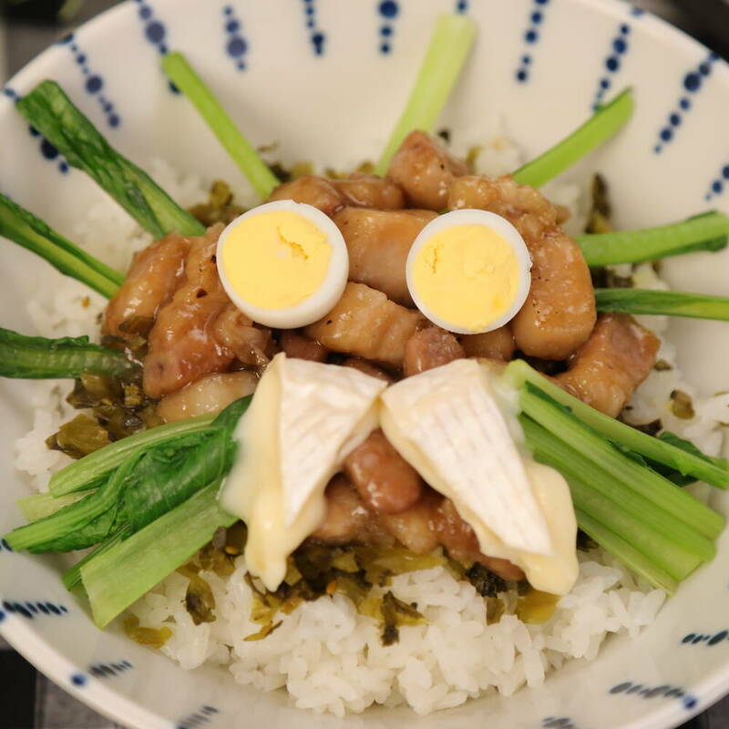 器にごはんを盛り付け、高菜を平らに広げてのせる。その上に<5>を盛る。 <1>を顔周りに差し込む。