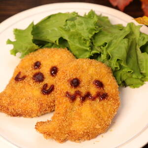 器にグリーンリーフをちぎってのせ、コロッケを盛り付ける。<8>でおばけの顔をかく。