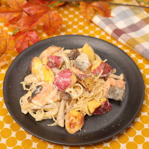 フライパンにサラダ油(分量外)を引いて中火で熱し、さつまいもを炒めてカリっと焼き色を付けて取り出す。