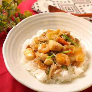再び中火にして混ぜながらとろみをつける。ご飯を器に盛り付け、上から餡をかける。