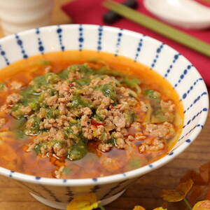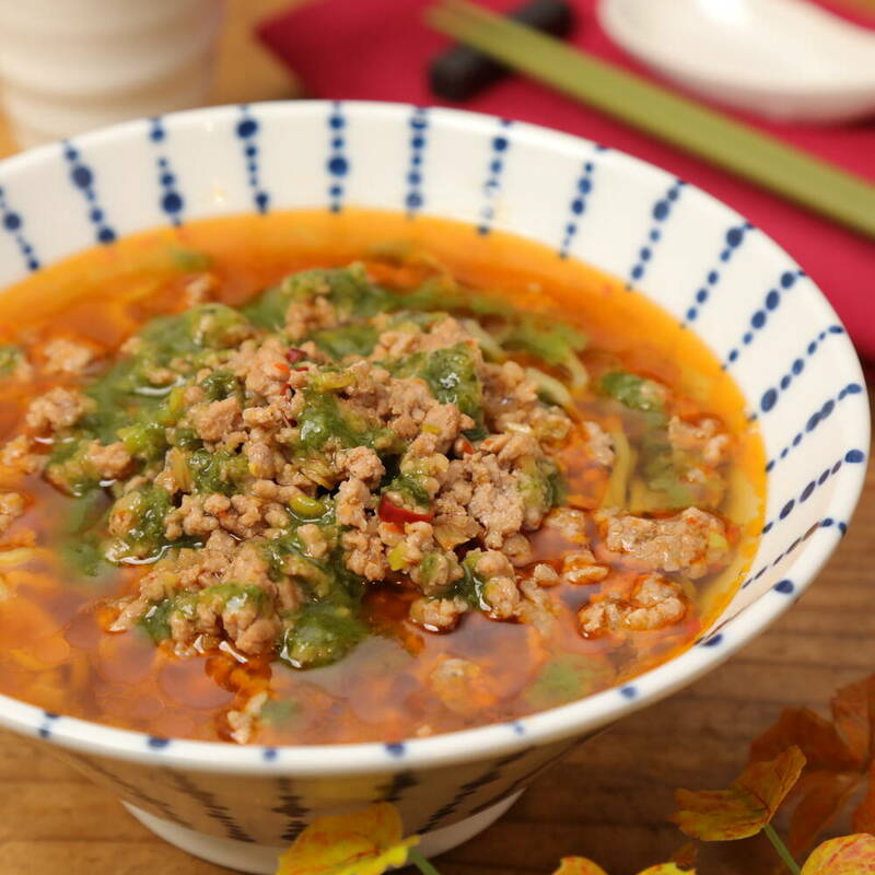 器に盛り付け、スープを注ぎ、肉味噌をのせる。ラー油、ジェノベーゼソースを回しかける。