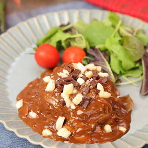 薄力粉を加えて粉っぽさがなくなるまで炒め、デミグラスソース缶、水、ウスターソース、ケチャップを加えて煮詰める。