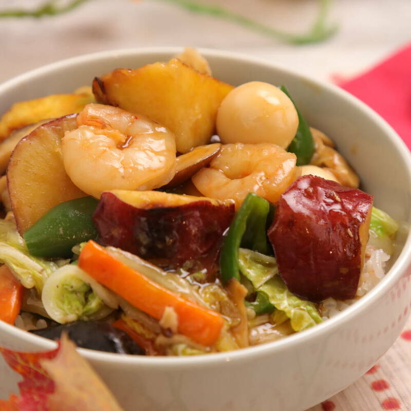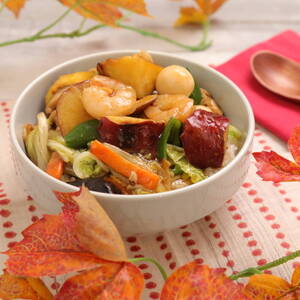豚肉に火が通ってきたらにんじん、ピーマン、白菜、うずらの卵、きくらげ、えび、【A】を加えてひと煮だちさせる。