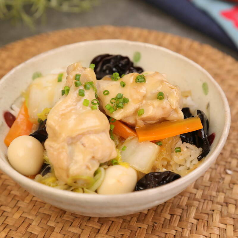 しんなりしたら<4>、うずらの卵を加えてさっと混ぜ、<4>の鶏のだし汁、【B】を加えて煮込む。