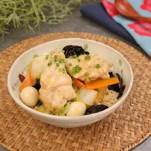 器にごはんを盛り付け、<7>をかける。青ねぎをちらす。