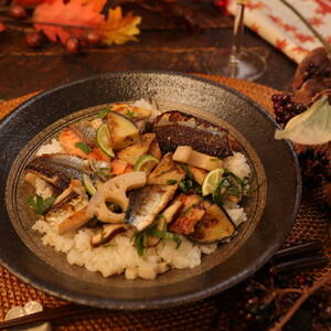 フライパンにサラダ油を引いて中火で熱し、ナスから炒める。全体に焼き色がついてきたらしいたけ、銀杏ぎりのれんこんを炒める。