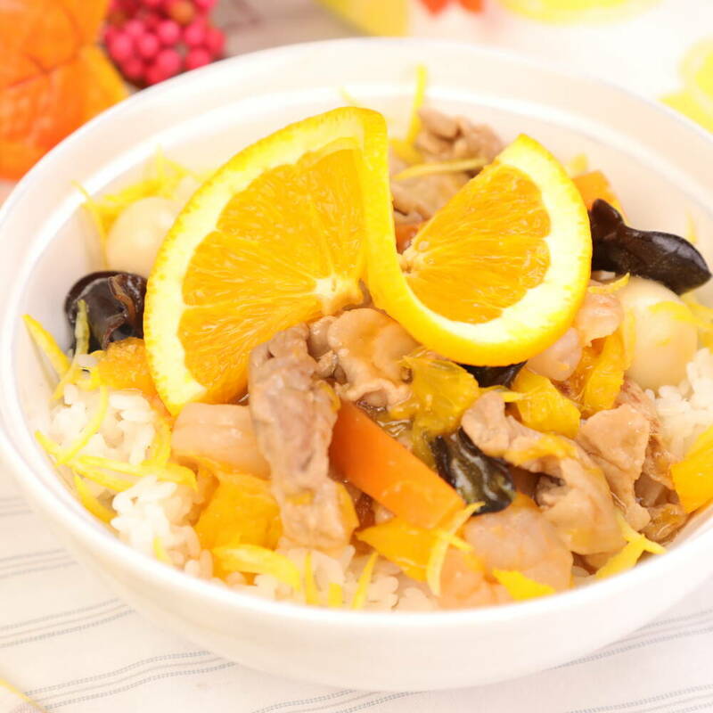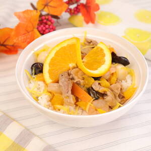 器にご飯をもり、<7>を盛り付ける。中央に<3>の輪切りオレンジ、周りに<2>を散らす。