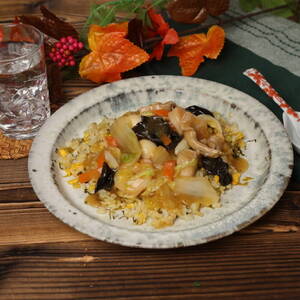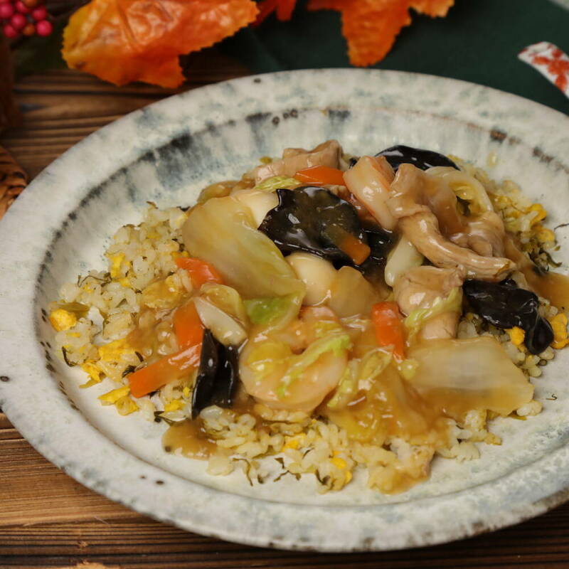 木べらでパラパラになるまでほぐし、鍋肌にしょうゆを回し入れ、焦がしながら混ぜ合わせる。器に盛り付ける。<4>をかける。