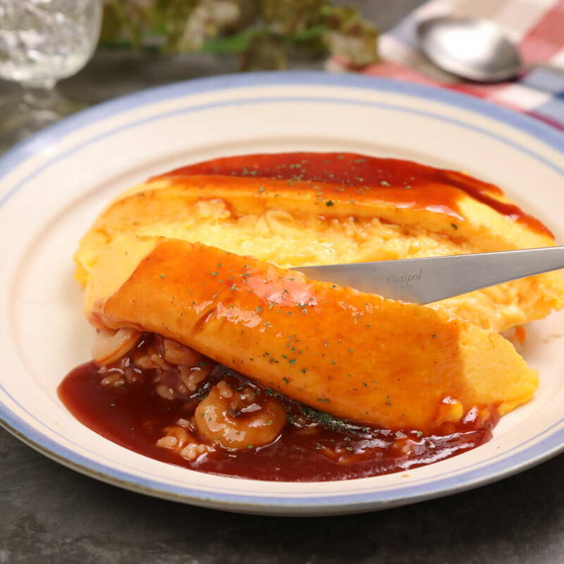 卵を奥にスライドさせ、フライパンの柄の下の部分をトントンとたたくか、ヘラを使い、卵の奥側を手前に返してとじる。