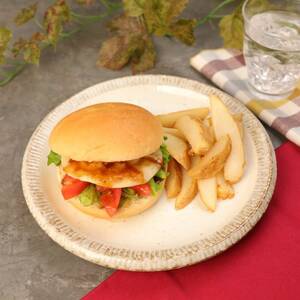 器にバーガーを盛る。ポテトをのせ、粉チーズと粗びき黒こしょうを振る。