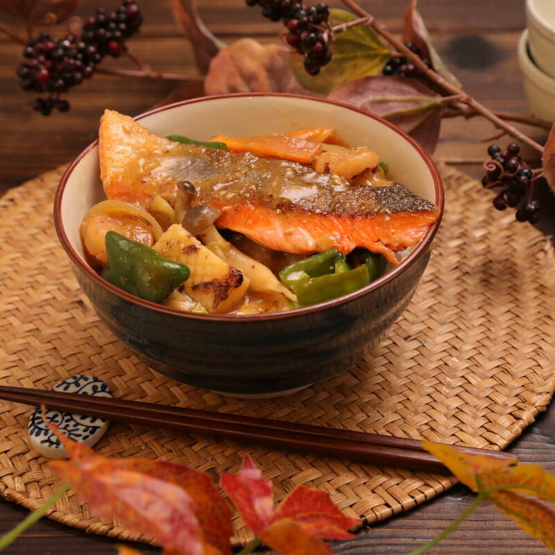 器にご飯をよそい鮭をのせる。<11>を盛りつけ、取り分けておいた【A】を回しかける。