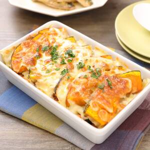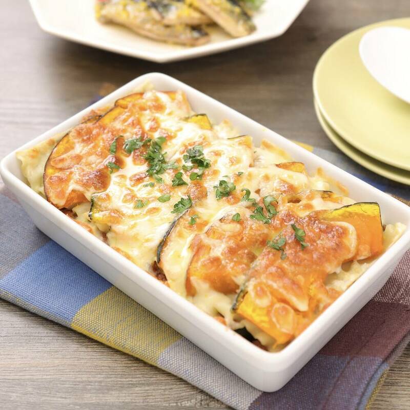 再度ラザニアをひき、残りの<10>、かぼちゃ、ミックスチーズをのせる。トースターでチーズがとけるまで焼く。