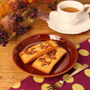 生地を絞り袋に入れ、1個25〜27gずつ絞る。上に角切りのさつまいも、メープルナッツ(各3g)をトッピングする。