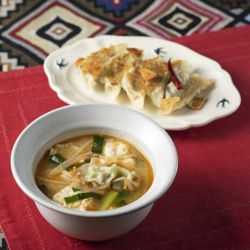 ひと煮立ちしたら豆腐をスプーンですくって入れる。餃子、もやし、にら、キムチを入れて蓋をし、弱火で5分煮る。