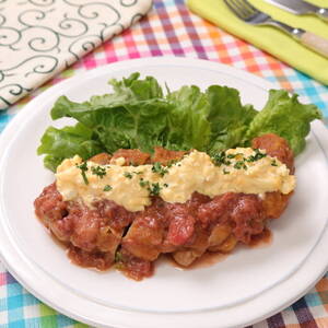 <7>を<4>にくぐらせるように両面にたっぷりつけ、器に盛り付ける。<6>をかけてパセリを散らす。