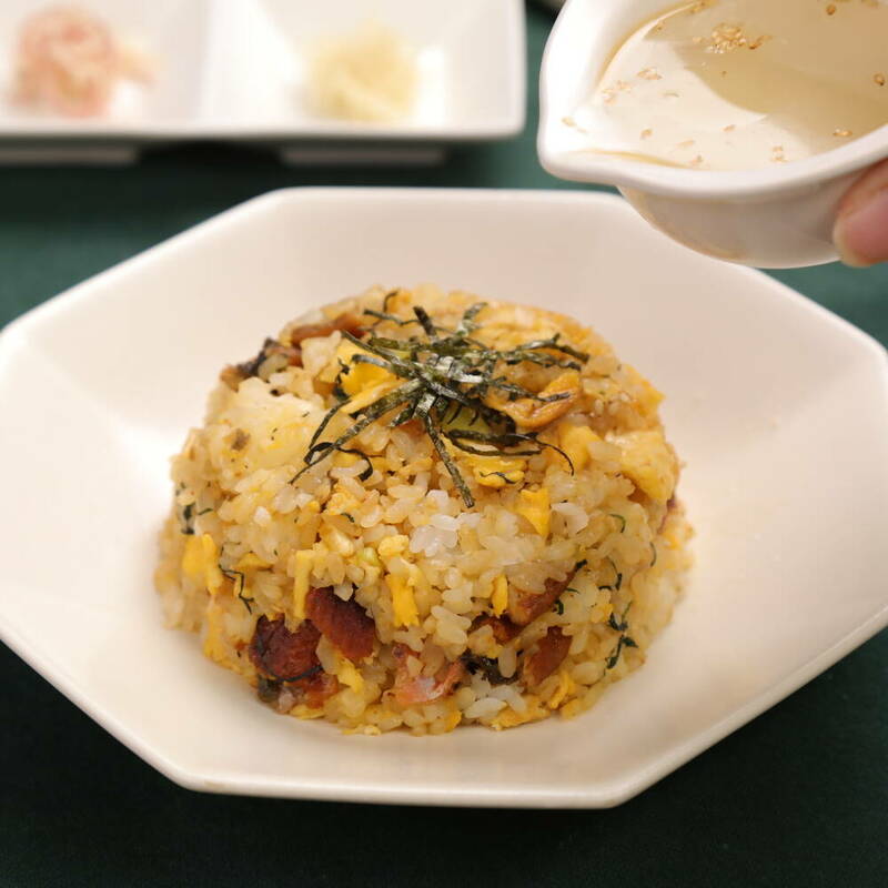<5>をドーナツ状にし、真ん中にしょうゆを入れ、焦がしじょうゆにしてから、全体を混ぜ合わせる。鶏がらスープの素を加え、ご飯を煽るように炒める。