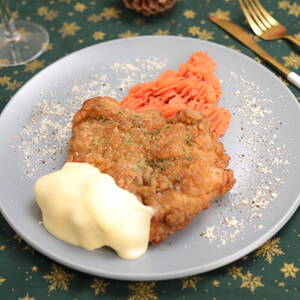 【盛り付け】フライドチキンを皿の中央にのせ、チキンの上にトマトマッシュポテトをサンタ帽子になるよう絞る。手前にチーズソースをヒゲに見立ててかける。