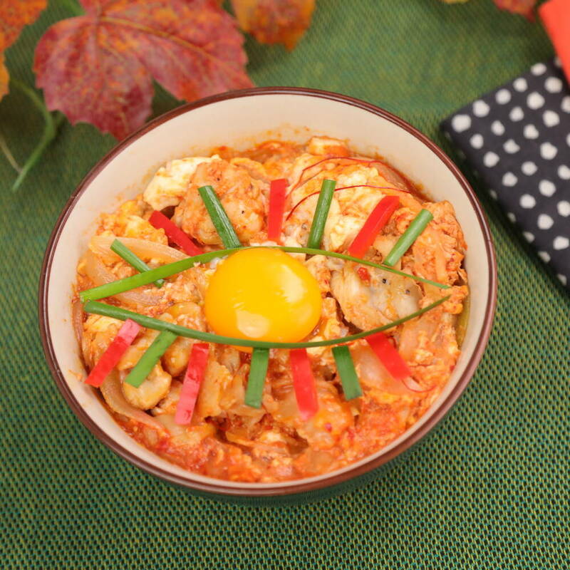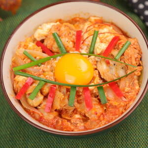 【盛り付け】器にごはんを盛り付け、<7>をのせる。中央に卵黄をのせる。卵黄を目玉に見立ててニラをおく。