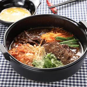 <2>で取り出した牛肉、キムチ、<1>を入れてひと煮立ちさせ、蓋をして1分蒸し焼きにしたら火を止め、白ごまをかける。