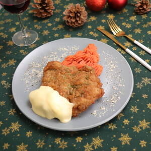 【盛り付け】フライドチキンを皿の中央にのせ、チキンの上にトマトマッシュポテトをサンタ帽子になるよう絞る。手前にチーズソースをヒゲに見立ててかける。