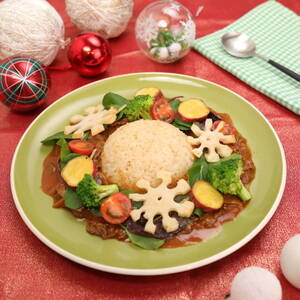 【トッピング】れんこんを雪の結晶に見立てて切る。(れんこんの穴の部分に切り込みを入れる)さつまいもは大きさを見て半月切りか輪切りに切る。ブロッコリーは小房に分ける。
