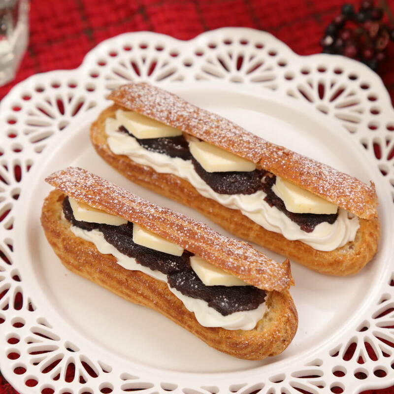 生クリームを絞り、つぶあんを10g盛り付ける。バターを3箇所におき、カットした生地をのせる。泣かない粉糖をかける。