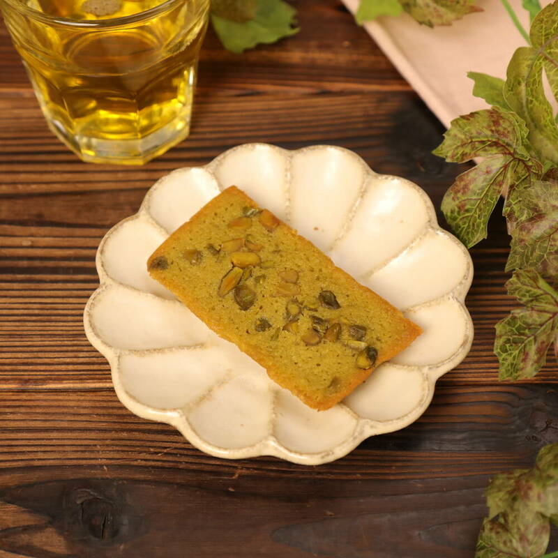 <3>に<4>を加えて混ぜる。温かいうちに絞り袋に入れて、<1>の型に絞り出す。生地を絞ったら全体にピスタチオを散らす。