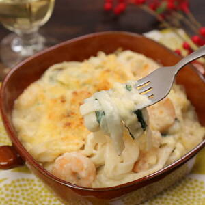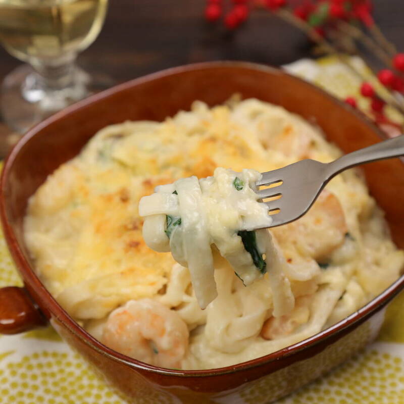 フライパンにオリーブオイルを熱し、海老を炒める。海老の色が変わってきたら、玉ねぎ、マッシュルーム、ほうれん草を加え、塩こしょう少々をして炒めて取り出す。
