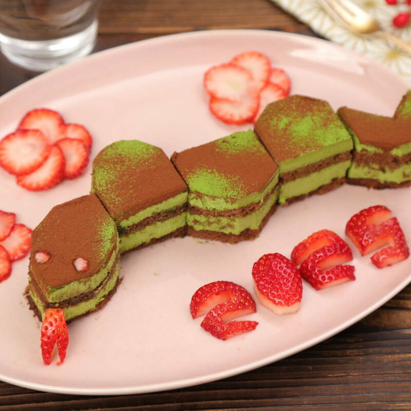 お皿に蛇の形になるようティラミスをのせる。舌、目をつけ、「2025」を手前におく。輪切りにしたいちごを梅の花に見立てる。