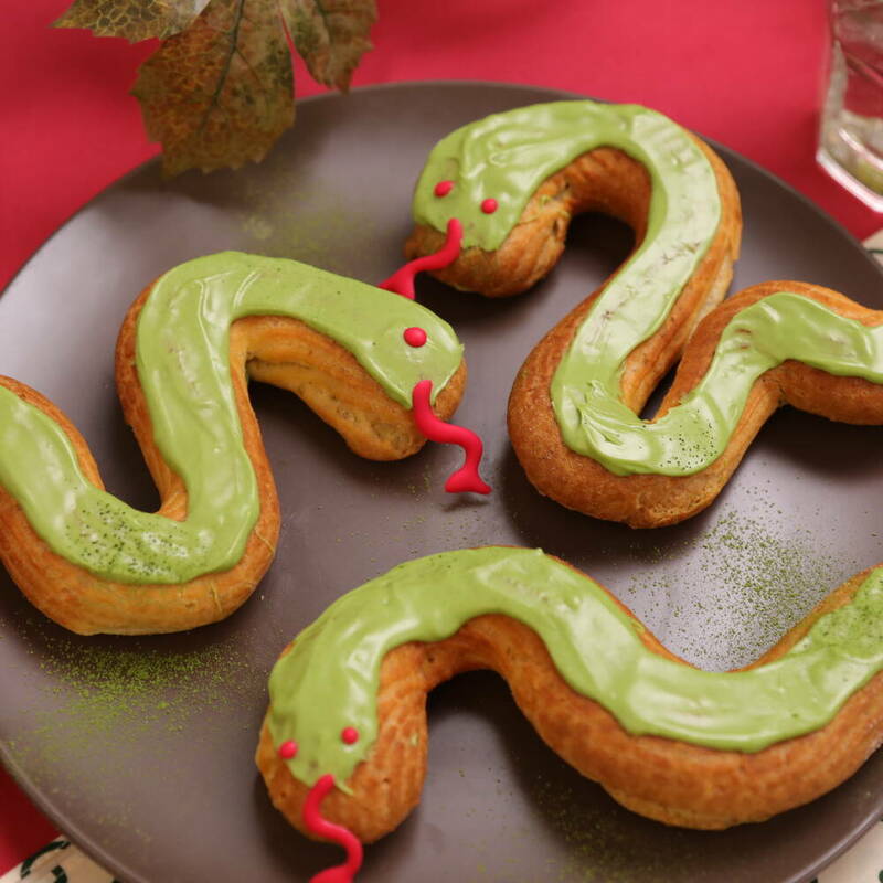 星口金(18切、直径1.5cm)のついた絞り袋に入れる。クッキングシートをしいた天板にへびの形に絞る。