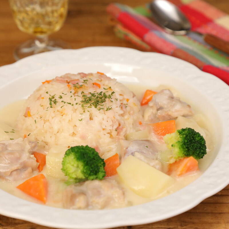 【盛り付け】器にピラフを盛り付け、シチューをかける。ピラフの上にパセリをふる。ブロッコリーを添える。