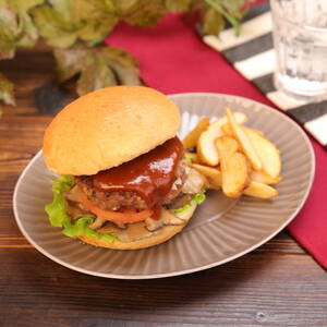 パテをのせ、デミグラスソースをかける。バンズで蓋をし、ポテトを添える。