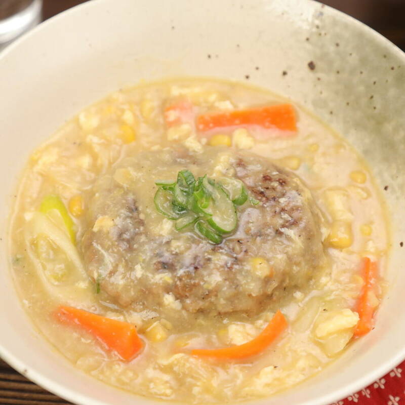 <5>にクリームコーン缶、水、鶏がらスープの素を加え、ひと煮立ちしたら<2>のねぎ(青い部分)以外を入れる。