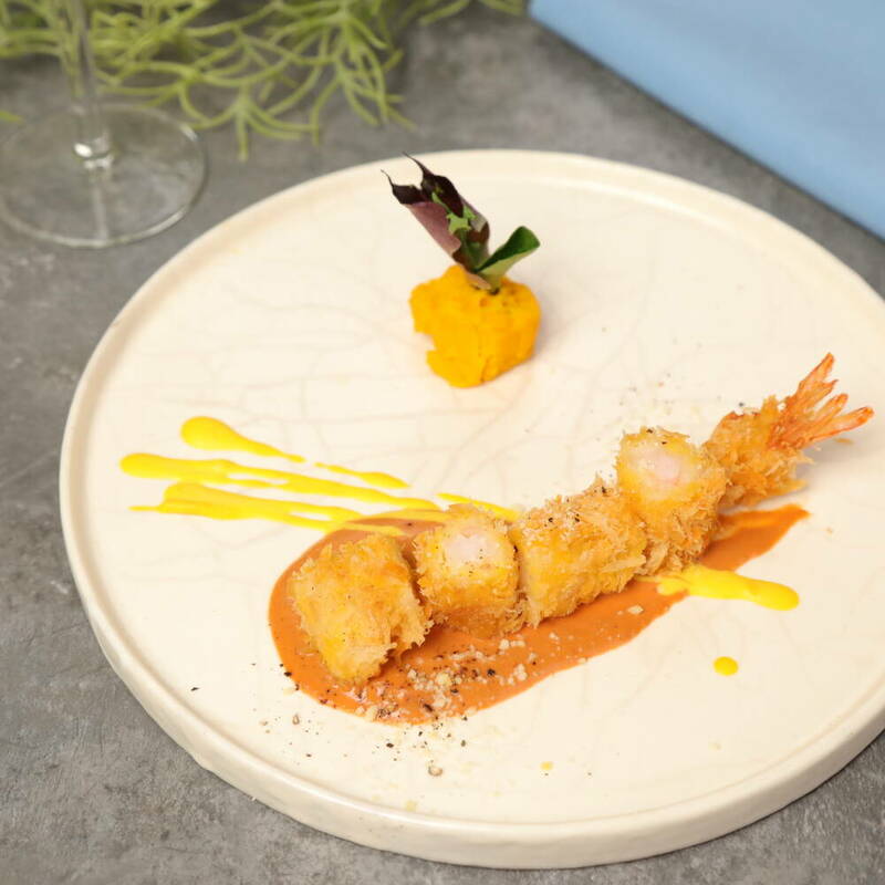 エビフライを4等分する。マッシュパンプキンを器にもりつけ、ベビーリーフを差す。