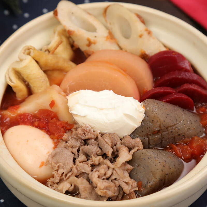 大根、こんにゃく、はんぺん、ちくわ、ゆで卵を入れ、中火にかける。ひと煮立ちしたら<4>を入れ、弱火で4~5分ほど煮込む。